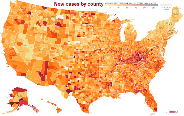 | New York Times map, adapted by Kentucky Health News, shows Kentucky is a national hot spot. |